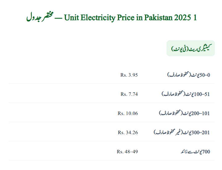 1 Unit Electricity Price in Pakistan 2025 – Quick Table