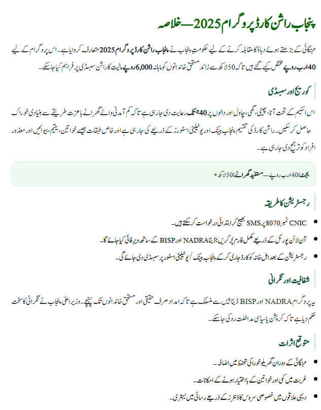 The 40 Billion Ration Card Program 2025 is one of the biggest welfare schemes launched for low and middle-income families. With a Rs. 40 billion budget, digital transparency, and easy registration methods, it provides genuine relief to over 5 million families. This program is a strong step toward fighting inflation, ensuring food security, and building a fair welfare system in Punjab. Families who qualify are strongly encouraged to register without delay.