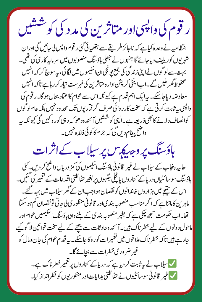 Punjab Govt Launches Action Against Illegal Housing Societies After Floods Illegal housing societies are not only a financial con but also a social problematic. They destroy trust, cheat truthful citizens, and increase risks during natural tragedies. By captivating plain action, the Punjab administration is showing that rules matter and corruption will be chastised. This will also recover city preparation, as only approved schemes will be allowable. Citizens will feel safer when they know their money is capitalized in legal societies. Severe laws and consequences will also discourage upcoming fraud. In the long run, this act will recover both cover safety and public trust.