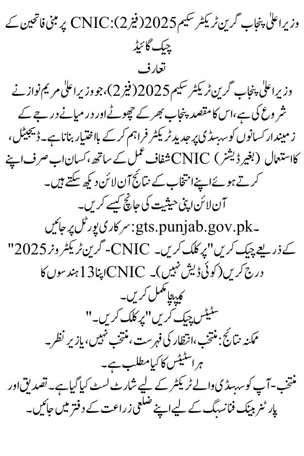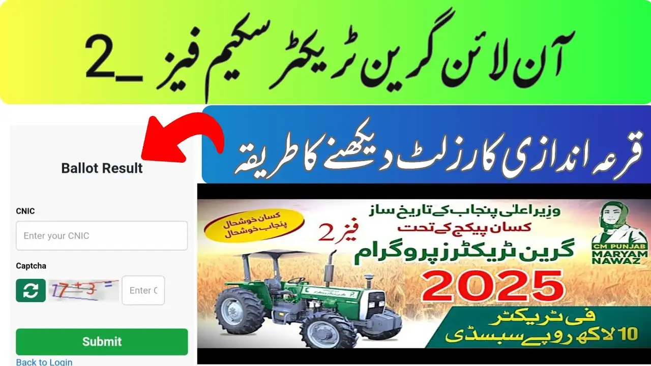 The CM Punjab Green Tractor Scheme October 2025 (Phase 2), launched by Chief Minister Maryam Nawaz, aims to empower small and medium land‑holding farmers across Punjab by providing subsidized modern tractors. With a digital, transparent process, farmers can now check their selection results online using only their CNIC (without dashes).