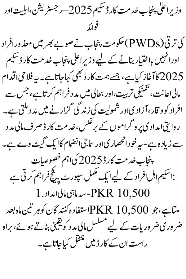 The CM Punjab Khidmat Card Scheme 2025 is a revolutionary step towards building an inclusive and empowered society. It not only offers financial assistance but also opens doors to rehabilitation, technical training, and social mobility for persons with disabilities.
