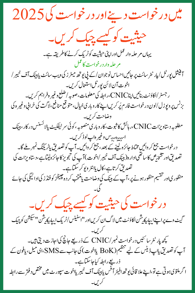 Application / Status Method | Online (via portal / Bank of Khyber / Akhuwat partners) |