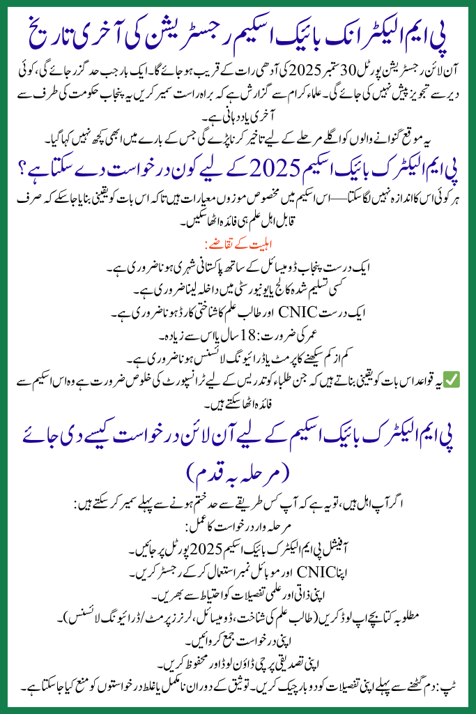 The PM Electric Bike Scheme 2025 has touched its final deadline. Academics and young persons across Punjab have just 1 day left to apply. The Administration of Pakistan has formally announced that the last date to apply is 30th September 2025, and no new recordings will be putative after that.