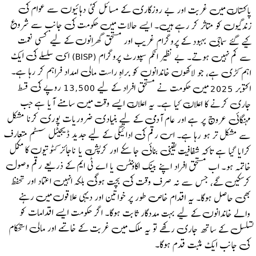 The Government of Pakistan has made a top discover news announcement regarding the Benazir Income Support Programme (BISP). Families registered under BISP will now receive an installment of Rs. 13,500 starting from the second week of October 2025. This initiative is targeted at households suffering from poverty, rising inflation, and flood-hit communities. Payments will first be released in 59 districts across the country.