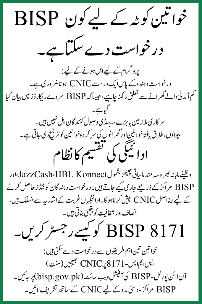 The BISP 8171 Women Quota 2025 is a vital step towards empowering Pakistani women by offering them targeted, transparent financial assistance. With a clear registration system and monthly support, women can manage basic expenses, support children’s education, and improve their quality of life. Eligible applicants are strongly encouraged to complete their registration via SMS or the online portal to start receiving benefits.