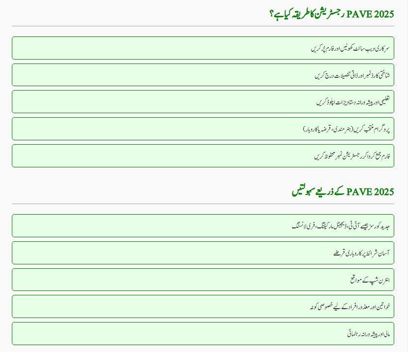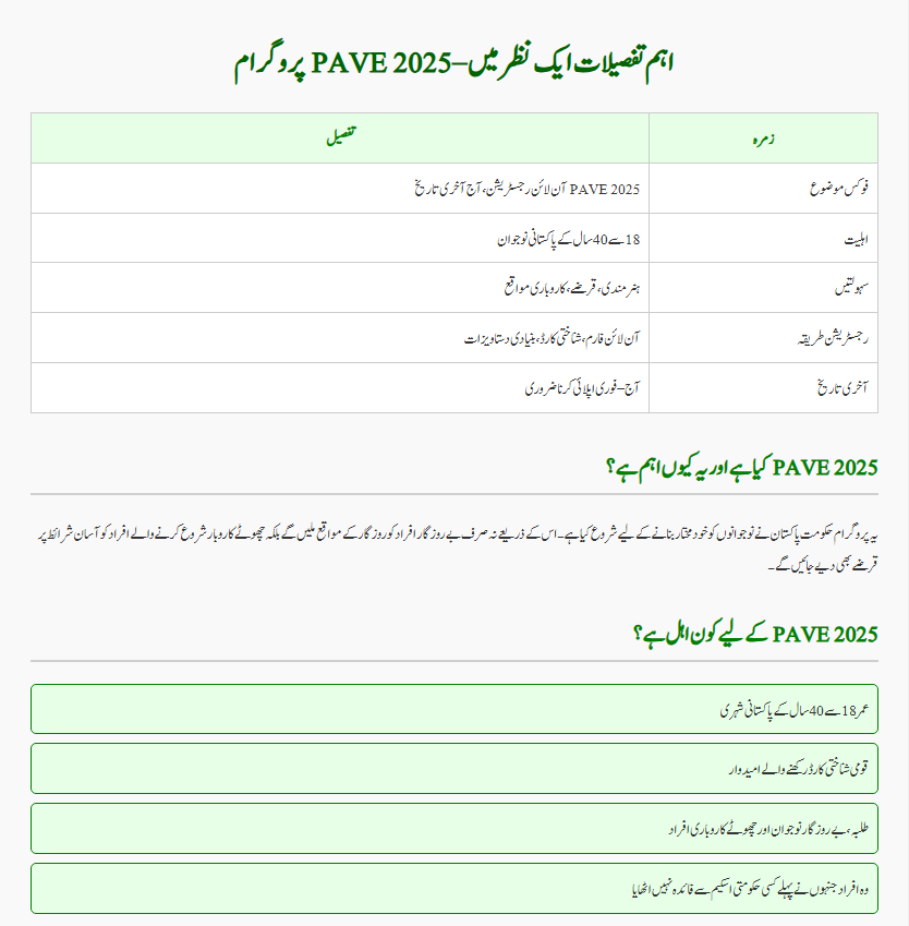 All Pakistani citizens aged 18 to 40 with a valid CNIC are eligible. - What facilities does PAVE 2025 provide?