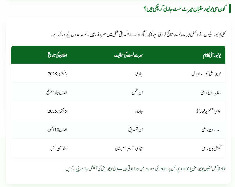 Several universities have already published their final merit lists, while others are still in the verification process. For example, the University of Sahiwal was among the first to release its 2025 merit list. Other major universities in Punjab, Sindh, KPK, and Balochistan are expected to announce their lists soon.
