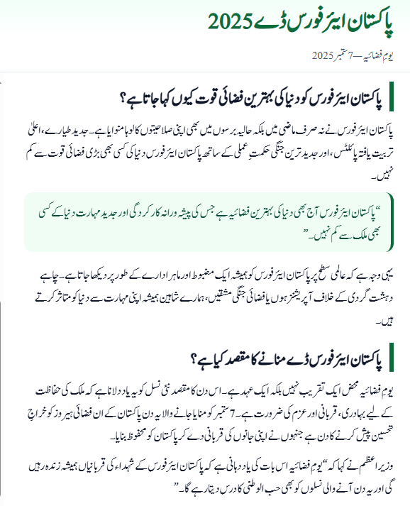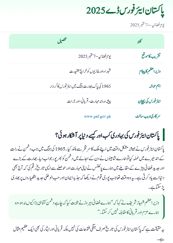 On Air Force Day, September 7, 2025, Prime Minister Shehbaz Sharif paid tribute to the martyrs and veterans of the PAF, saying: “Our air warriors are the true heroes whose sacrifices are written in golden words in history.”
