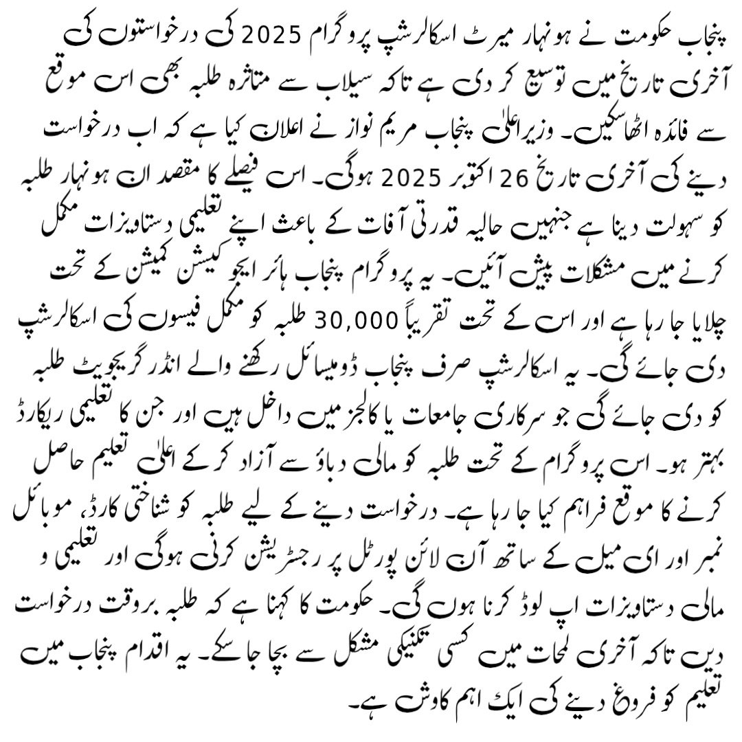 The Punjab government has officially extended the deadline for the Honhaar Merit-Based Scholarship Program 2025, giving flood-affected students additional time to secure their future. This extension is a relief for thousands of students who faced delays due to natural disasters and financial hurdles. With nearly 30,000 scholarships available, the initiative ensures that deserving students can continue their education without interruption. By covering tuition fees for undergraduates, the scheme stands as a strong step toward educational empowerment in Punjab.
